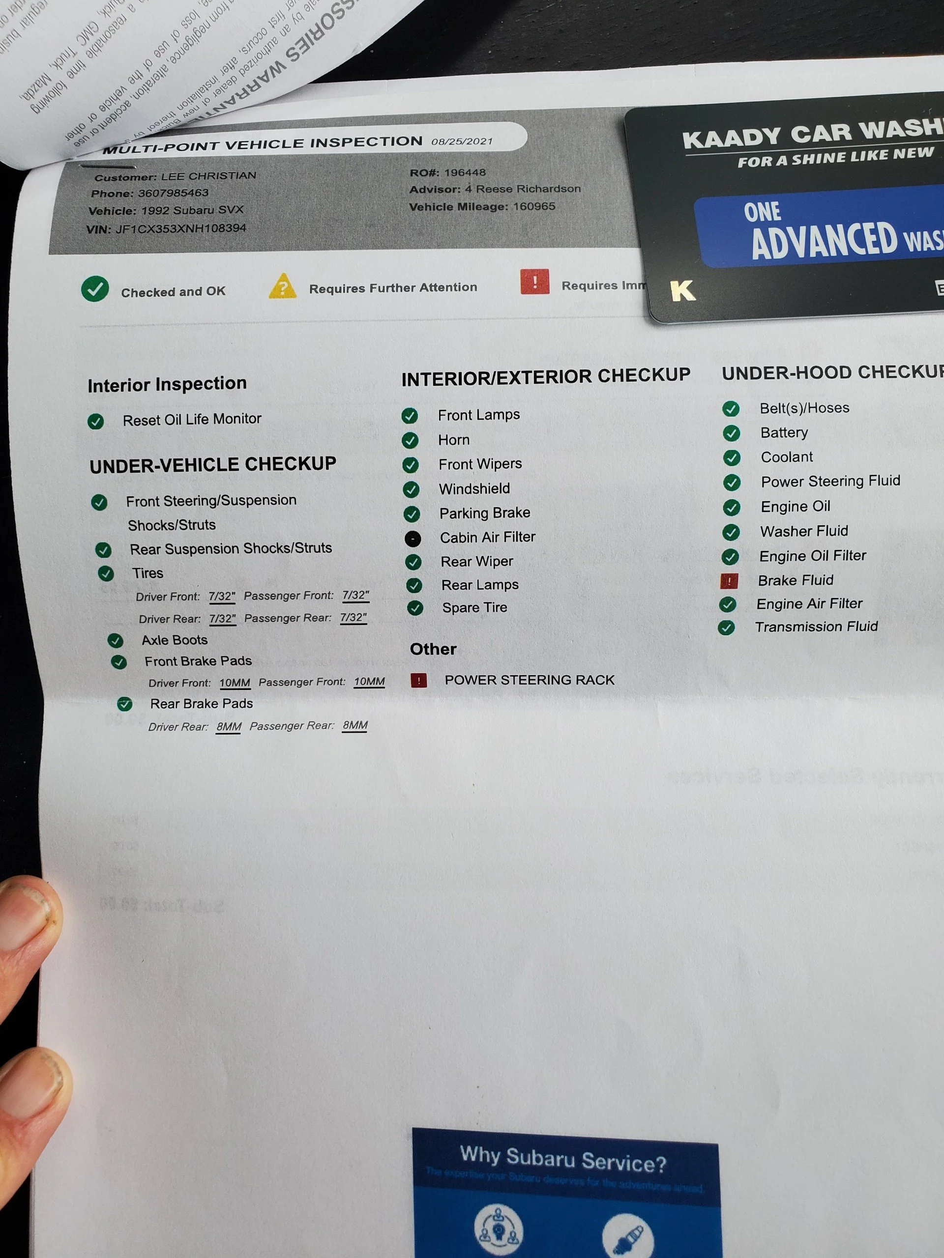 Vehicle serviced - Maintenance inspection completed - Transmission checked - Brake light bulb(s) replaced - Battery/charging system checked - Timing belt replaced - Alignment checked